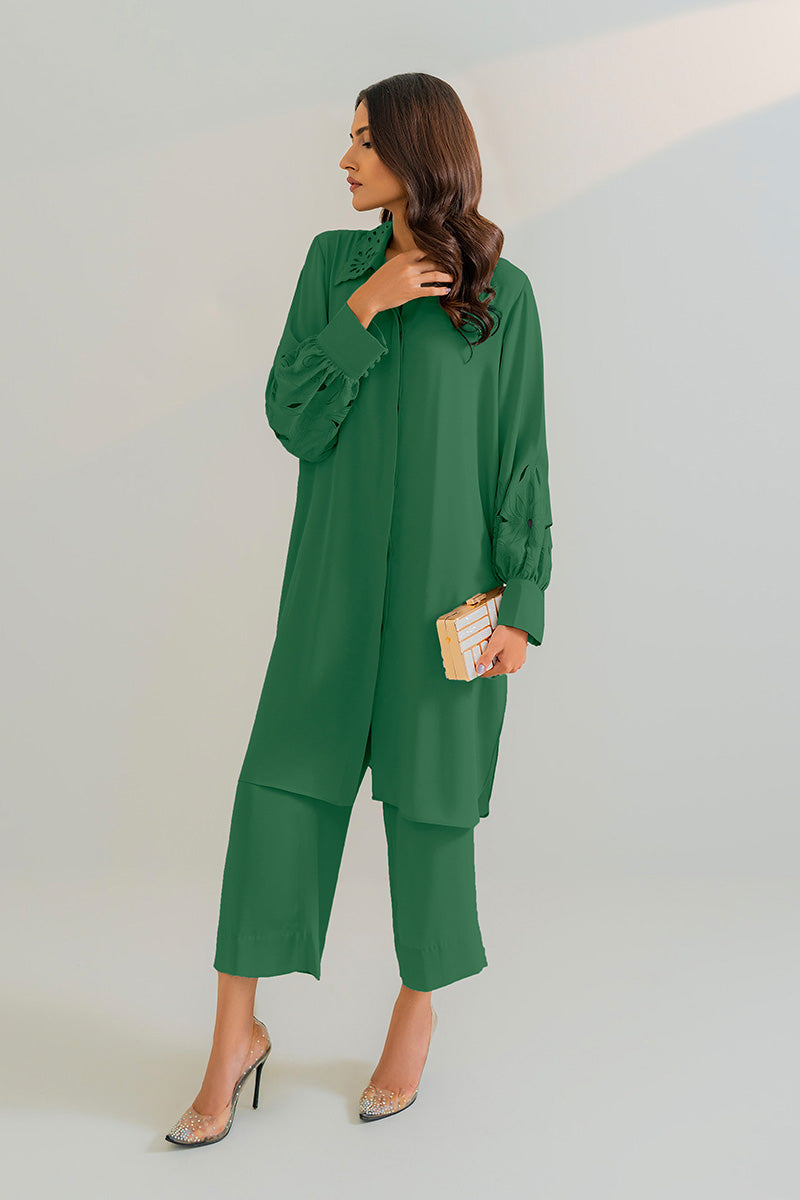 Perfect for juggling a busy day. It features a front-open button-down shirt with an embroidered cutwork collar, balloon cuff sleeves with embroidery and cutwork details, paired seamlessly with matching culottes, making it total wardrobe goals!