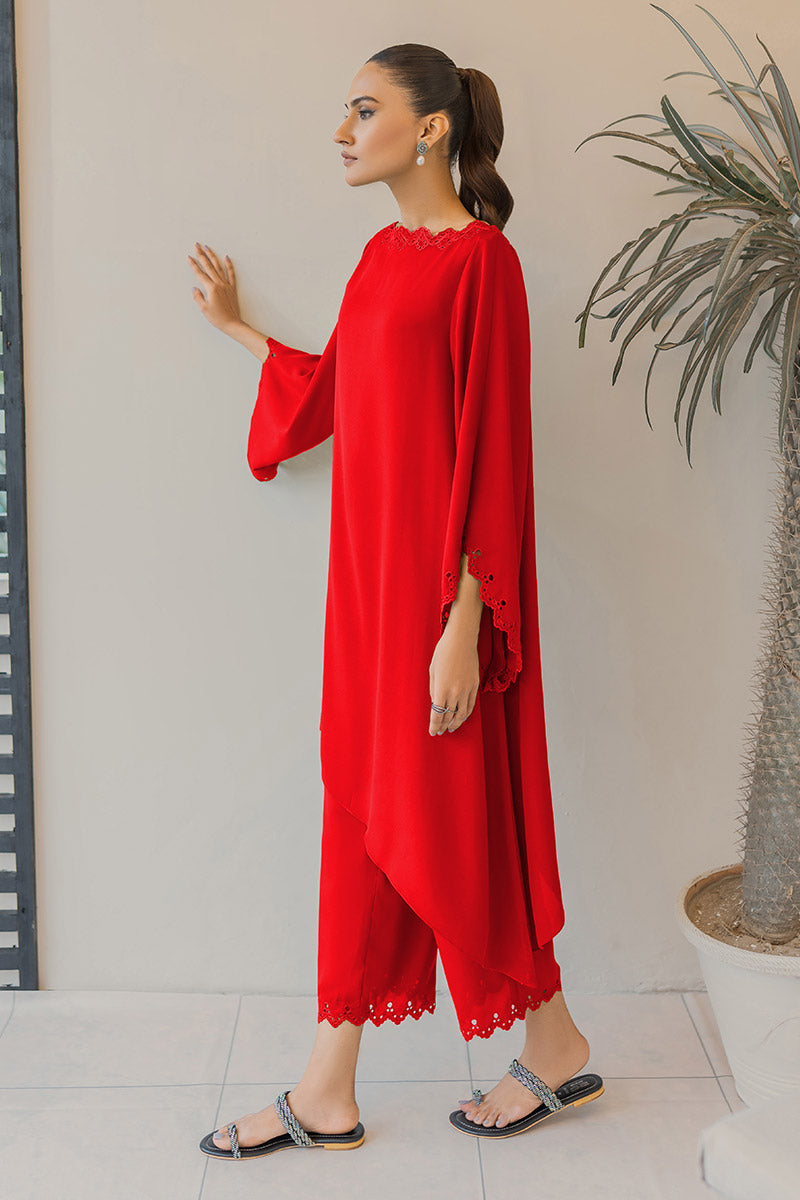 Make a statement and turn heads with our two-piece ensemble, 'Olesia' This eye-catching outfit features a skew shirt with intricate cutwork embroidery on sleeves and neckline, radiating a traditional craftmanship style.