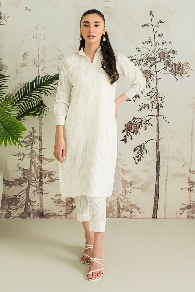 For a modern look don on our white straight silhouette accentuated with a centi ban neckline and embroidered pattern.