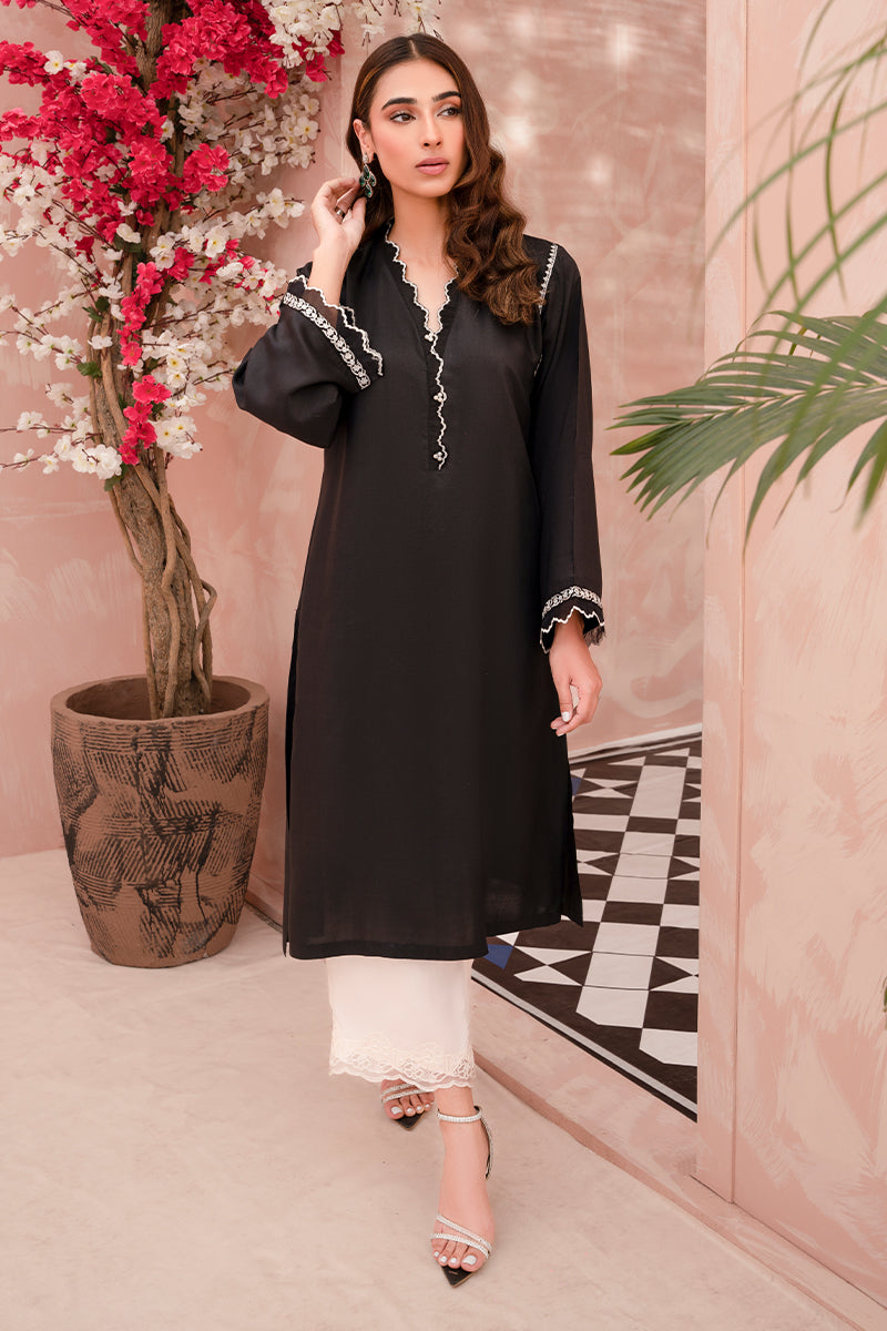 A celestial black chrome canvas weaves a tale of elegance, as 'Quin' embraces an exquisite embroidered composition in shades of ivory. Once paired here with embroidered organza dupatta and embroidered pants this look unfolds luxurious grandeur for this eid.