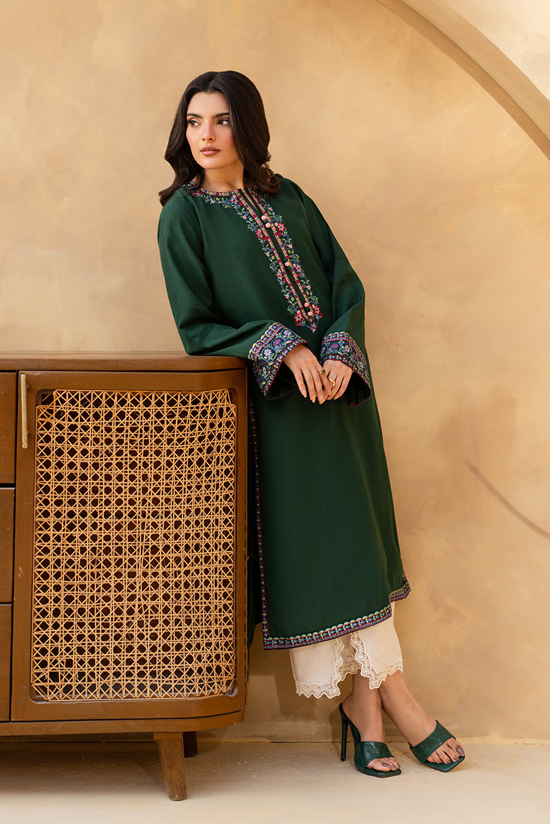 Floral magic meets modern elegance! This straight shirt features a round neckline adorned with multicolored floral embroidery and finished with delicate buttons. Flared sleeves with embroidered cuffs and side-slit detailing add movement and grace, while Sen culottes and an organza dupatta with all-over embroidery and embroidered borders complete the effortlessly stylish look. Perfect for dawat nights, brunches, or any festive gathering, this ensemble is all about effortless Eid glam.