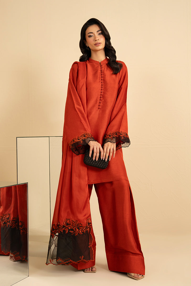 For a chic Eid look, choose our Rua Russet, the 'It' trend of the season. Featuring the perfect hue of rust, this set includes short shirt adorned with contrast embroidered sleeves and our signature Farshi shalwar. Complemented with a medium silk dupatta adorned with contrast embroidery patches, for a complete and refined style.