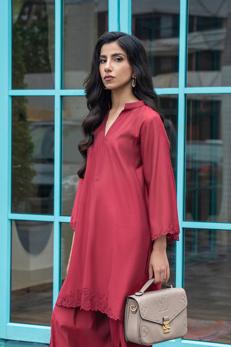 A straight shirt with centi band neckline, finished with delicate embroidery on the sleeves and hem, paired with a flowy farshi shalwar — perfect for breezy lunches, coffee catch-ups, or just looking chic while running errands.
