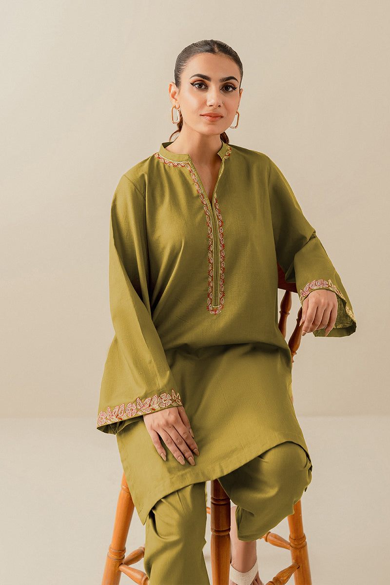 Step into winter with 'Sesame' a stylishly relaxed ensemble that strikes the perfect balance between cultural richness and modern sophistication. The A-line shirt takes center stage, showcasing a centi-band embroidered neckline and sleeve border. Paired seamlessly with a classic shalwar this is a must have wardrobe essential.