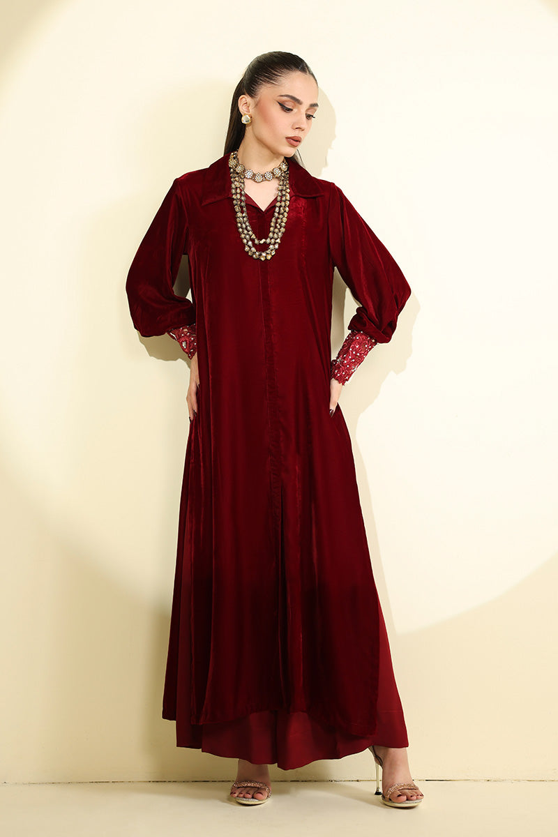 A masterpiece in design the long shirt is elevated with a refined collar neckline and statement balloon sleeves, adorned with ada work on cuffs. Paired with flared pants, it embodies luxury with modern grace.