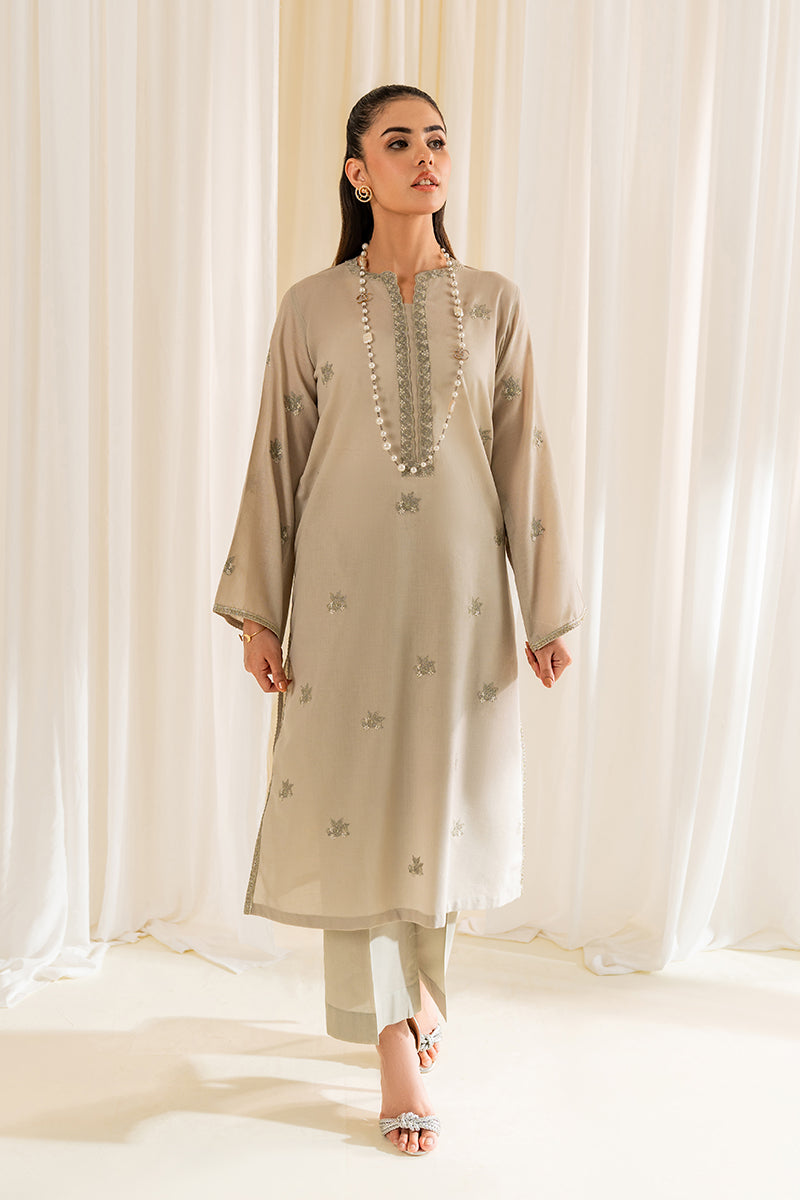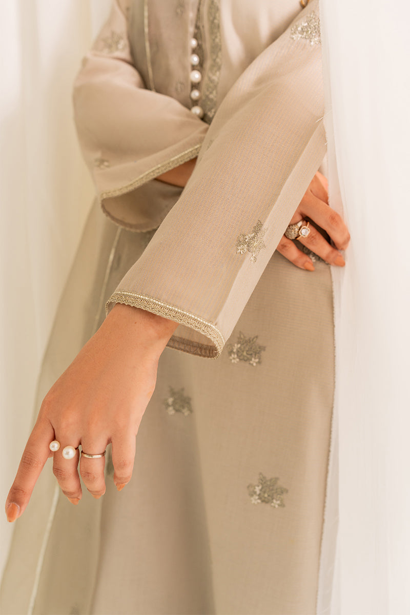 A symphony of grey hues on a textured jacquard base is created with delicate tilla embroidered neckline and spray detail on shirt front. Layered over matching straight pants and paired with a gorgeous organza dupatta with gota and embroidery details, this ensemble embodies elegance and style, a perfect ode to Eid celebrations.