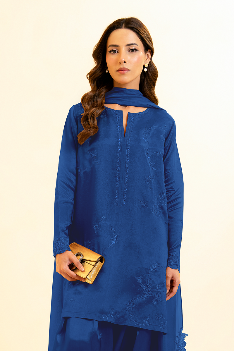 Lets get you into this season's craze: Yale Farshi set! An embroidered short shirt and signature farshi shalwar are enhanced by a medium silk dupatta featuring meticulously embroidered patches. Perfect choice for your summer gatherings.