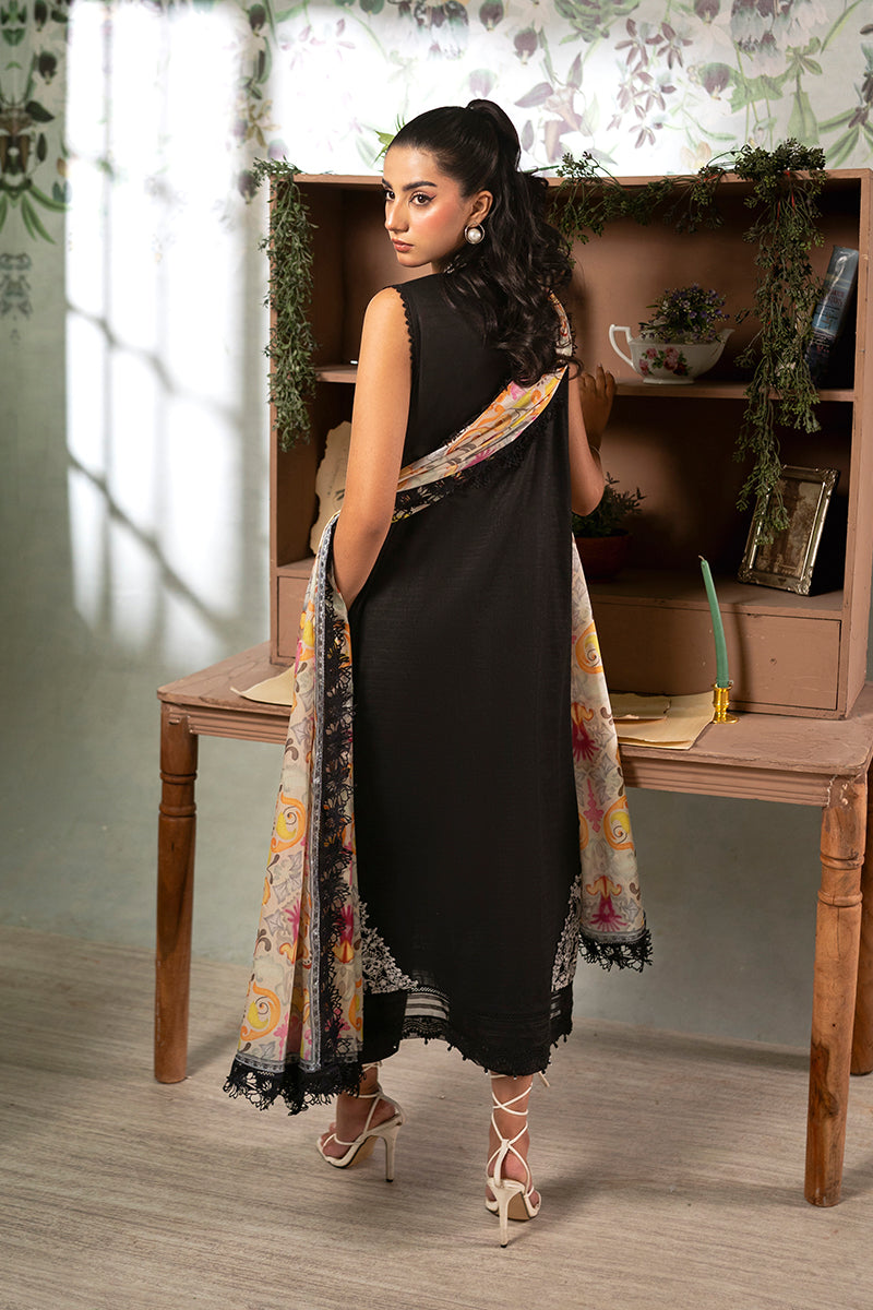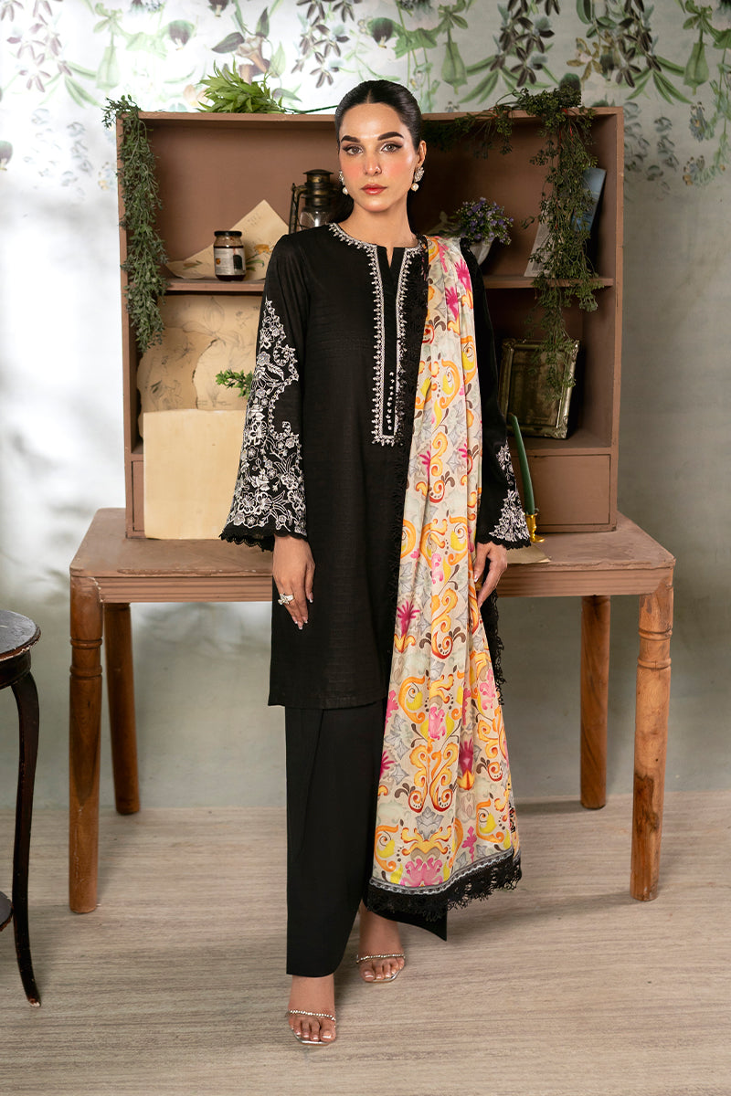 Introducing "Zaiza" featuring on a black canvas adorned with ivory exquisite floral embroidery. Accompanied by a printed dupatta having bright colours to enhance the garment's overall look. This classic monochrome ensemble with colourful hues on dupatta is a must have for your wardrobe.